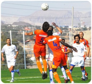תחילת המשחק הייתה של המקומיים. הילאל מוסא (בכתום) אדם דדון מאחור(צילום: מאיר אוחיון)