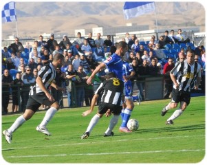 בלם אילת סימן טוב עם הכדור שקרוקה משקיף מהצד.(צילום מאיר אוחיון)