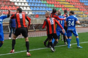 המהומה השנייה. בויטר מתקרב באיום לעבר שחקני ירושלים (צילום: רועי אלחנני)