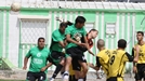 שחקני מודיעין חוגגים עם אלון מכיס את שער היתרון.(צילום:אנס אבודעבס)