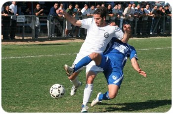 מרמורק פתחה ברגל ימין. איתן בר (בלבן) ועידן שמש (צילום: בועז רביד)
