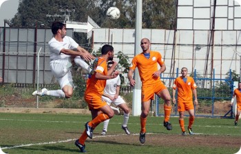 יחיאל חיאווי (בכתום)ונתנאל בן אבו רוצים את הכדור,שרעבי משקיף מאחור