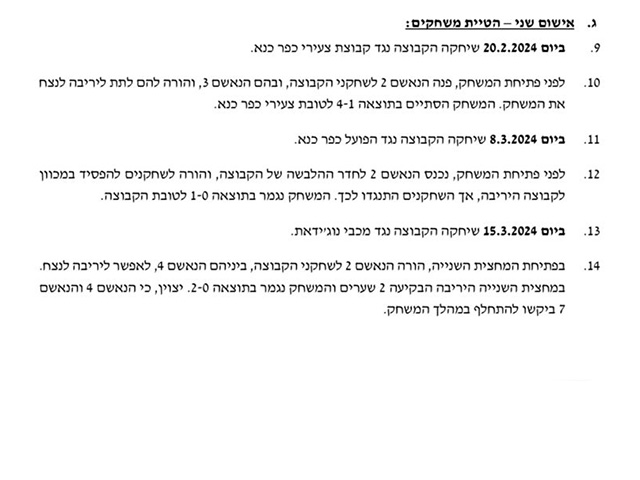 סעיף האישום השני על הטיית משחקים כולל לא פחות מ-9 משחקים. לפי כתב האישום בתאריך 20.2.24 שיחקה הקבוצה נגד צעירי כפר כנא. מתוך כתב האישום נכתב כי לפני המשחק פנה פאדי מחאמיד לשחקני הקבוצה ובהם מוחמד עותמאן והורה להם לתת ליריבה לנצח את המשחק שהסתיים בתוצאה 1:4 לצעירי כפר כנא.