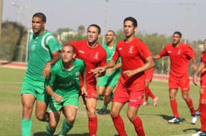 הופעת בכורה בעמישב. מוחמד חטארי (בירוק) שניר שטרית גולש ומחלץ את הכדור(צילום: שלומי גבאי)
