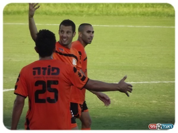 עומר פרץ חוגג עם חבריו את שער היתרון. (צילום: אלון יהודיוף).