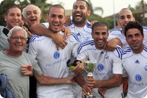 נפצע והוחלף. הקפטן, כפיר שנסי מקבל את הגביע מחיים אזולאי, יו"ר מכבי יבנה (צילום: לירן דורף)