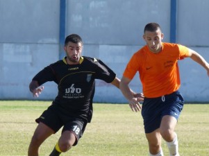 השקמה שיחקה על הגבהות. ישראל גורן (בכתום) בולם את לריס (צילום: גיא גולדפרב)