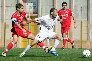 חזר למגרשים. אופיר חיים במאבק אוירי עם איתן בר (צילום: לירן דורף)