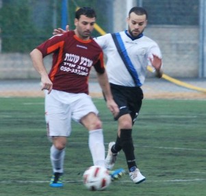 פתחו את המשחק בסערה. יוגב קלטצקי (בלבן) מול משה חג'ג' (צילום: אמיר דבי)