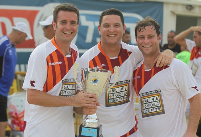 כוכבי ערוץ הספורט-פשכצקי,אקרמן ויונתן כהן חוגגים עם הגביע.(צילום: שלומי גבאי)