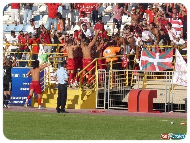 הסדר בעיר נשאר על כנו. שחקני מרמורק חוגגים בסיום עם האוהדים (צילום: גיא גולדפרב)