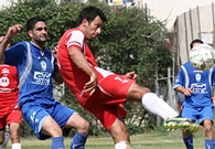 אילן בוחבוט בן ה-43(באדום)מגן על הכדור מפני רן עגייב ממחנה יהודה.(צילום:לירן דורף)