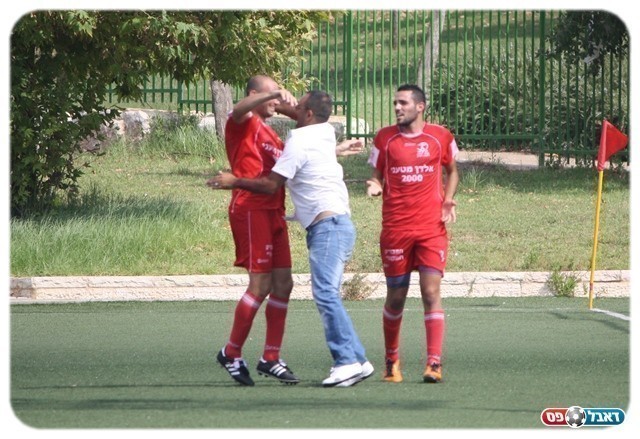 מודיעין נעלמה. בכר חוגג עם ציון עזרא את השער (צילום: פזי שינדלר)