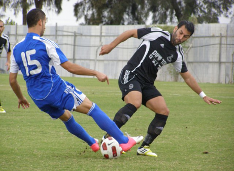 הזדמנות טובה שלו. צחקו (בשחור) מנסה לעבור את ראמי דאהר (צילום: אמיר שיבי)