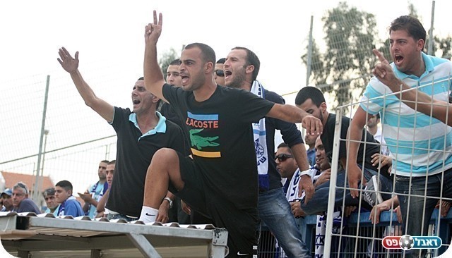 ניסיון לסולחה. אוהדי שעריים אומרים לאלמו מה הם חושבים עליו (צילום: לירן דורף)
