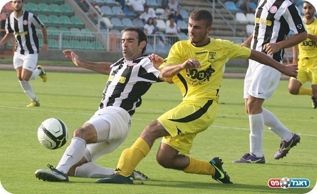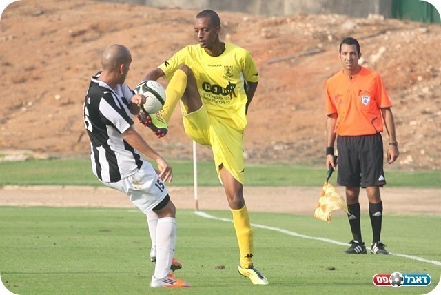 החילוף של המשחק. ראובן (בצהוב) מול קייזר (צילום: לירן דורף)