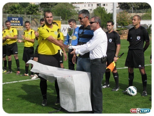 סגירת מעגל. ניסן מורד מעניק את הגביע לרפי אביסרור, קפטן חצור (צילום: עודד חסין)