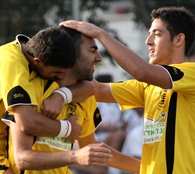איתמר יחיא(משמאל)בחיבוק אוהב לסבג לאחר השער.(צילום:לירן דורף)