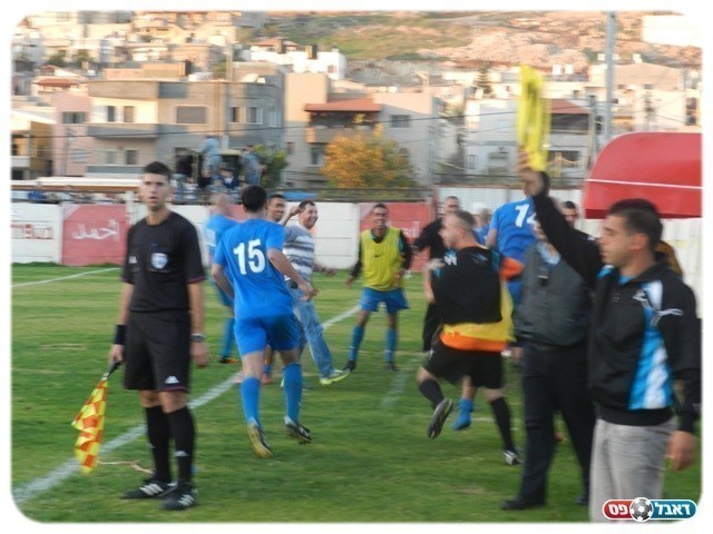 דקה מאוחר יותר הופסק המשחק למספר דקות לאחר שמגן כאבול, מוחמד עקרייה "קוצץ" ע"י הבלם המקומי, ראמי אבו חארב. המשחק המשיך עד שגם ענאן בושנק נפגע רק אז ניאות השופט, בן שוחט לעצור את המשחק. לאחר שהטיפול בשניים הסתיים שלף שוחט צהוב דווקא לעקרייה בעוון התחזות.