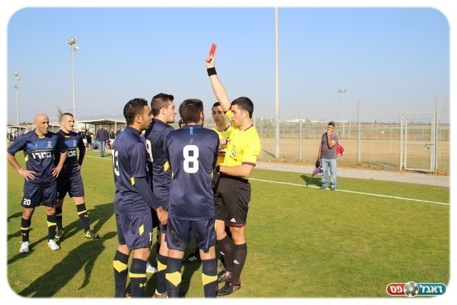 דקה לפני סיום המחצית החלה הדרמה על המגרש. פיליפ וולקובסקי שסחב צהוב דחף בשתי ידיו את בן זקן שהתרומם לנגיחה. השופט, אביעד שילוח שהיה קרוב לאירוע שרק לפנדל לזכות גלבוע. שחקני מגדל העמק רצו לשופט שלא יוציא צהוב שני על העבירה. הרוחות התלהטו בינתיים במגרש ואופק מלול בעט בעידן שפשה לנגד עניו של הקוון שרץ אל השופט ולחש באוזנו. שילוח קרא לשני שחקני מגדל העמק אליו והוציא לשניהם כרטיס אדום. אבי עמוס החל להשתולל תוך שהוא מכריז שהם מבחינתם לא עולים למחצית השנייה של המשחק.