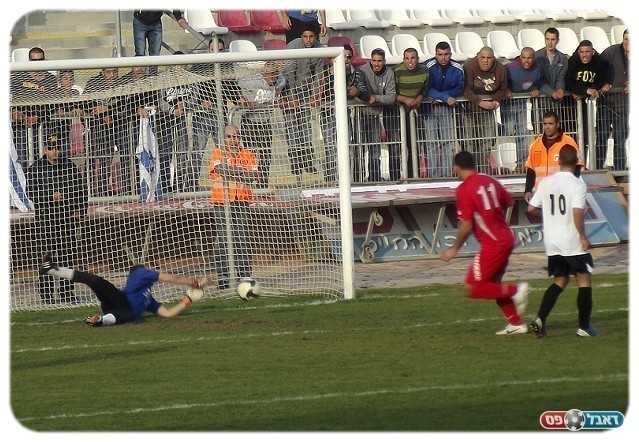 כל הקהל השתתק כשאבו יונס ניגש לכדור ובעט טיל שפגש את החיבור בין המשקוף לקורה והתעופף החוצה. הקונפטי נשאר בשקיות שלו ואנחת אכזבה קולקטיבית נשמעה מהיציע הביתי.