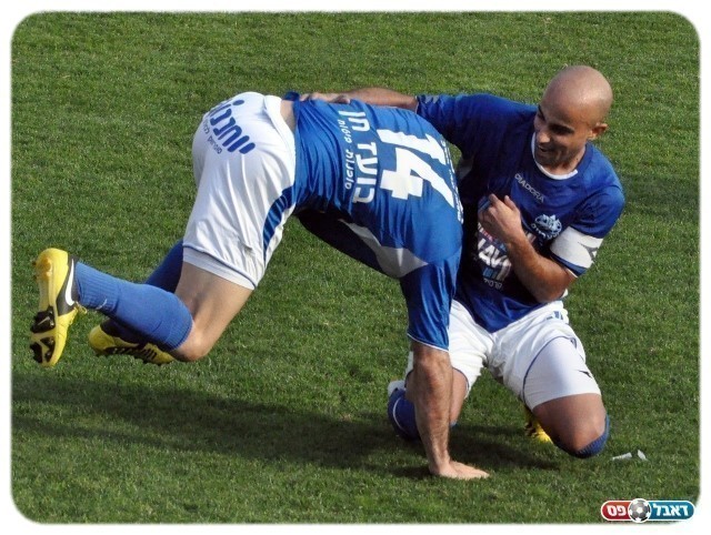 חגיגה כחולה באשדוד. ברק ורד חוגג את השלישי עם מתי אברהם (צילום: אורי גבאי)