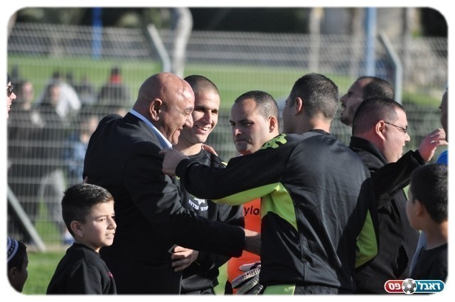 פעם ראשונה במשחק. ראש העיר, דוד בוסקילה מודה לשחקני הקבוצה (צילום: אורי גבאי)