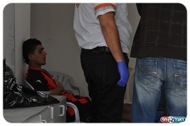 פתיחת המחצית השנייה התעכבה. רפעת אלעאסם מקבל טיפול (צילום: אורי גבאי)