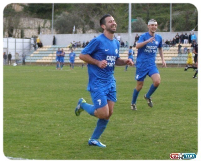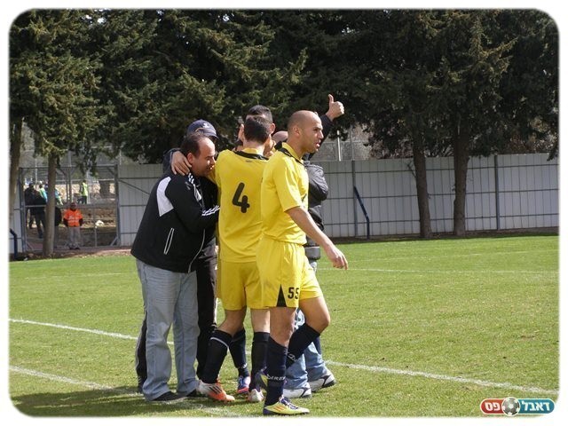 שבר בצורת ארוכה. עמר חוגג את השוויון עם החברים ועם הספסל (צילום: אמיר שיבי)