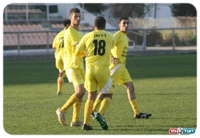 ארבע נקודות מנהריה. שחקני כפר קנא חוגגים את השוויון (צילום: מיכה פישנזון)