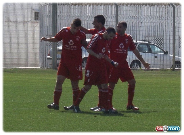 לא רצו להיכנס ללחץ. שחקני בועיינה חוגגים את השני (צילום: אבי פפיס)