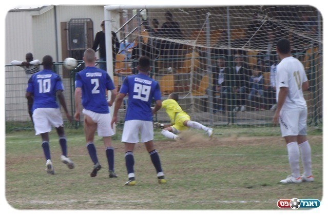 החסיר פעימה מאוהדי באר יעקב. אלפיניש מתכונן ובועט ליד הקורה (צילום: אלירן ברנשטיין)
