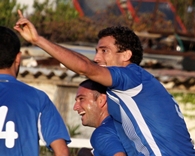 דודי בכר(במרכז)והחברים חוגגים את ה 1:0 של רמת גן.(צילום:לירן דורף)