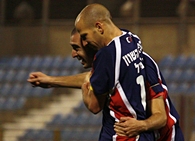 יניב דוד מחבק את כובש הצמד משה משען שמימין עופר סער מאושר.(צילום:לירן דורף)