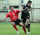 רועי אדרי(באדום)מלווה במבט את אורן גבאי מבית"ר פתח תקוה,היום במחנה יהודה.(צילום:לירן דורף)