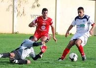 יוסי הייקושלר(באדום)מנסה להתל במני לוי מרמת ישראל.(צילום:אמיר דבי)